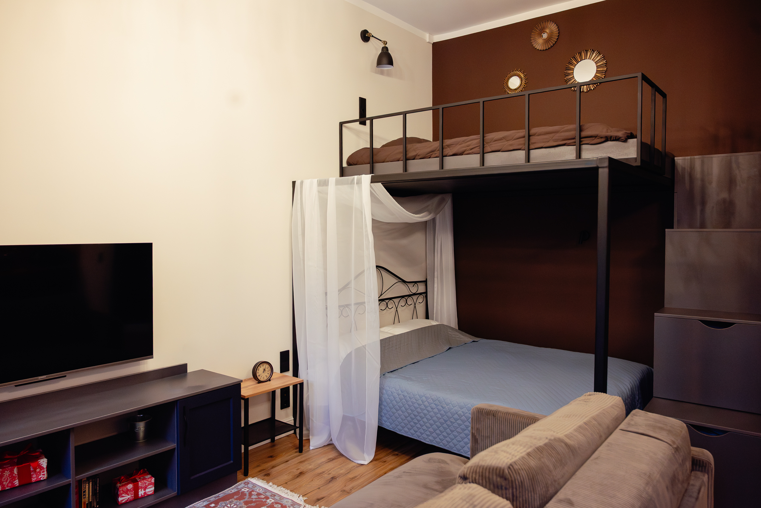 Двуспальная кровать, диван, второй ярус