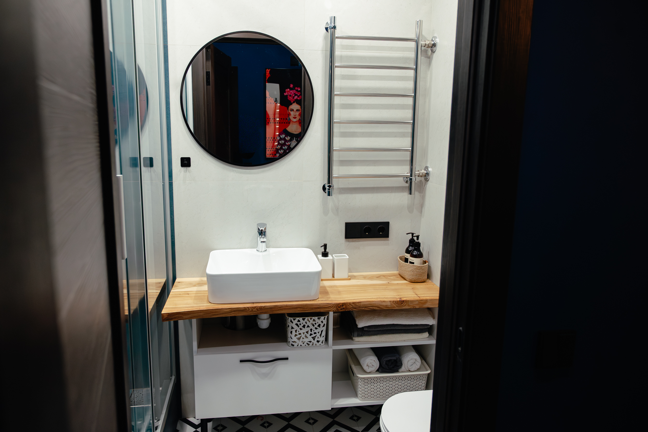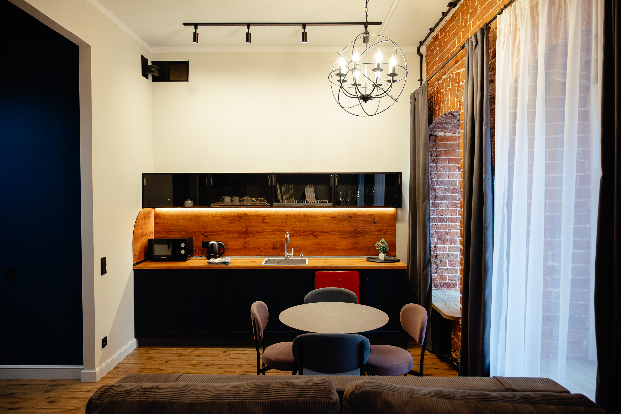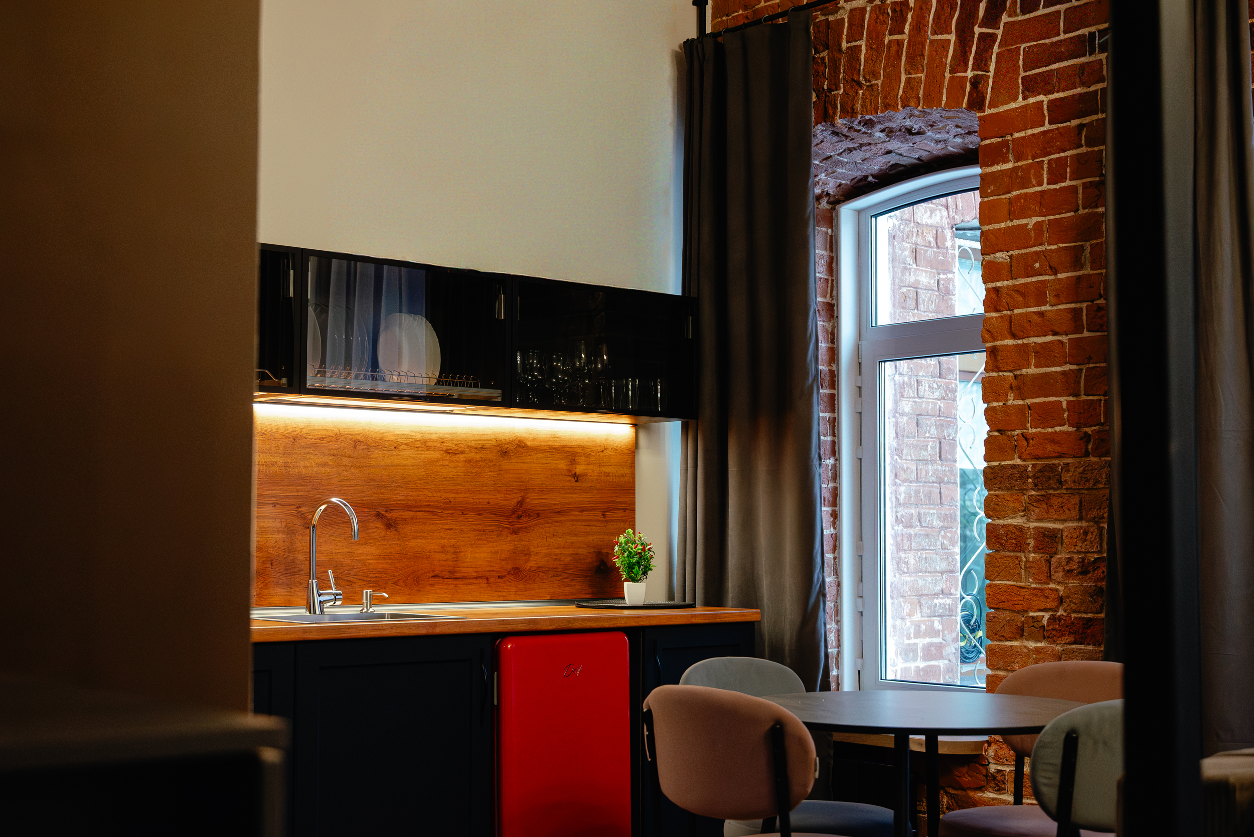 Квартира находится в старинном кирпичном доме. Спокойные оттенки, фактуры и продуманные детали создают ощущение уюта и приватности.